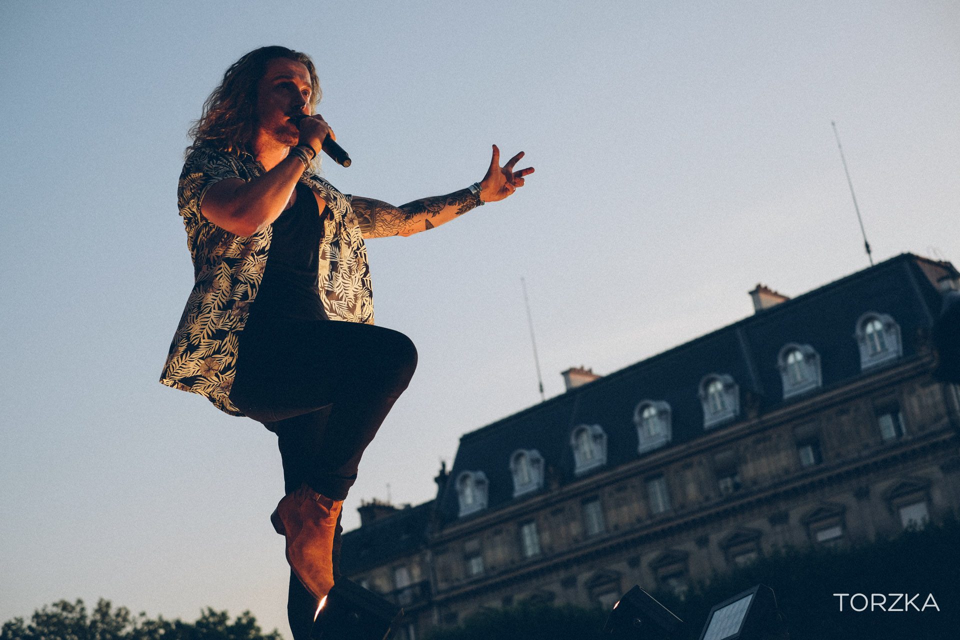 Autre découverte du festival, le franco-canadien Aliocha. D’ailleurs quand il nous a dit qu’il arrivait du Canada on avait du mal à le croire sans ce fameux accent. Accompagné simplement de sa guitare, Aliocha chante des chansons douces en acoustique. Émotions et fraîcheur venue du Québec, on ne dit pas non sous la canicule parisienne. Plus sérieusement, on s’est senti ailleurs (sur la route, sur une plage) en écoutant sa voix et rien que pour ça, c’était bien.