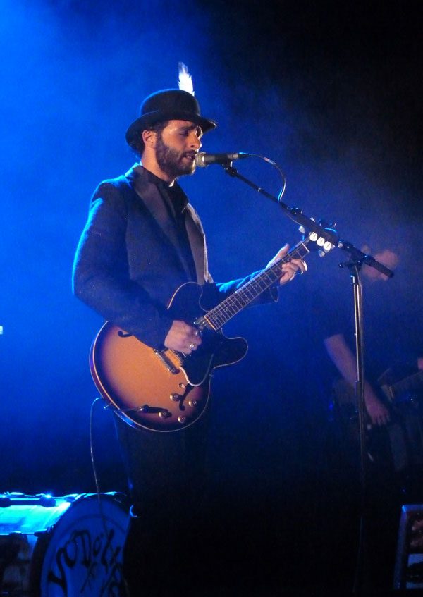 Les premières notes de Breathe In retentissent dans la salle, et l’Homme au chapeau apparaît. Electrisée, déjà, j’ai envie de me lever. Derrière le clown triste se cache Maxim, un artiste qui a prouvé qu’on devrait avant tout s’intéresser à ses talents musicaux. Yodelice n’est pas seulement un personnage, c’est un univers, un jeu de lumières, une scénographie étudiée. On est transportés ailleurs. C’est un peu les rêveries d’un promeneur solitaire, by night, le blues en plus, et le riff qui démange. Le seul inconvénient avec les petites salles, c’est que le public de province n’a pas forcément la ‘culture’ des concerts. Les gens sont un peu « bêtes et disciplinés » au début, mais toute la bande réussit à mettre le feu, prouvant ainsi qu’en province on se bouge aussi! Les 4 acolytes alternent les chansons inédites (Wake Me Up, My Blood Is Burning, que le public reprend en choeur!) et les tubes Sunday With A Flu ou encore Free: et tout le monde finit debout!
