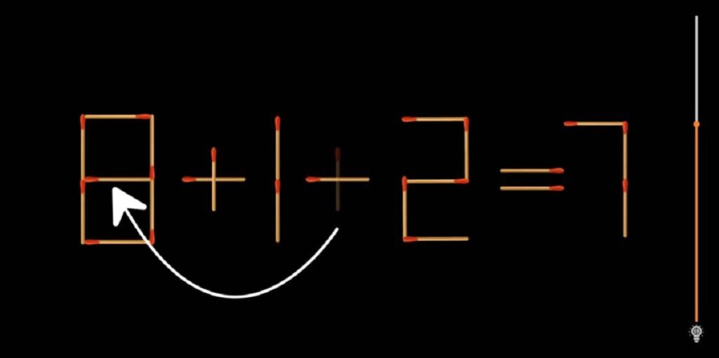 Alors, avez-vous réussi à résoudre ce défi en moins de 50 secondes ? Si oui, félicitations ! La réponse est la suivante : en déplaçant une allumette du zéro pour en faire un 8, l’équation devient correcte : 8 – 1 – 2 = 7. Astucieux, n’est-ce pas ?