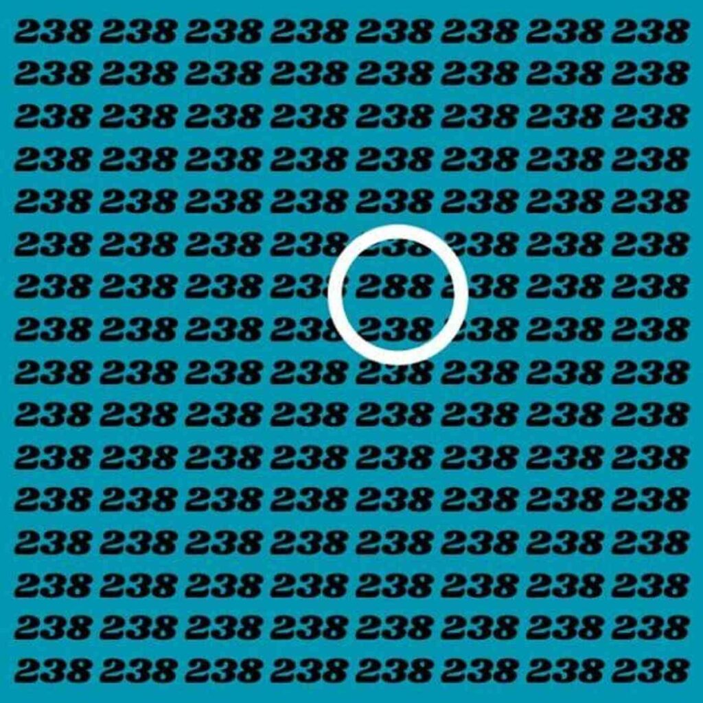Si vous avez réussi à trouver le 288 en moins de 20 secondes, félicitations ! Vous avez un sens de l’observation vraiment aiguisé. Pour ceux qui ont eu un peu plus de mal, ne vous inquiétez pas, vous n’êtes pas seuls. La solution est simple : le 288 est caché parmi les 238, un peu à l’écart et légèrement différent en taille ou en forme. Ces défis sont avant tout là pour nous entraîner, alors continuez à vous y frotter, vous deviendrez plus rapide à chaque fois !