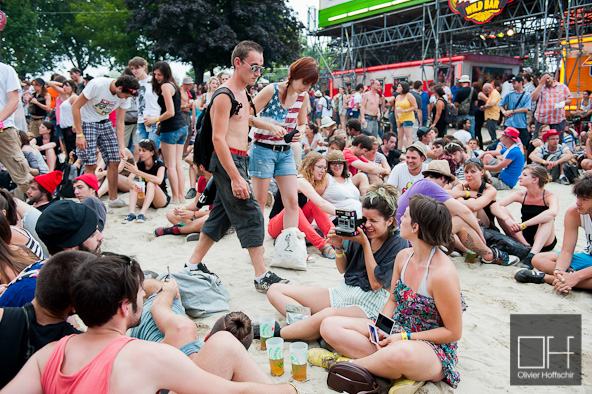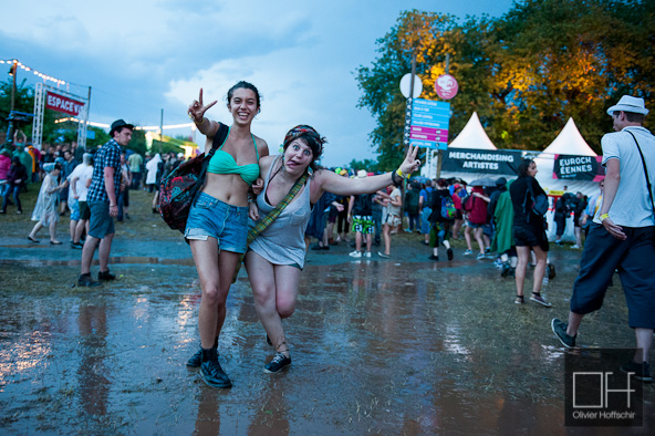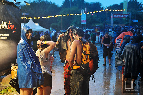 J’abandonne la scène de la Plage en pleine liesse pour m’abriter… un violent orage éclate… un déluge s’abat sur le domaine de Malsaucy. Les festivaliers courent dans tous les sens en quête d’un abri de fortune. Et puis, il y a ceux qui font avec…qui composent ou qui ont prévu le coup. Je découvre le véritable dress-code des Eurockéennes : Bottes en caoutchouc et K-way.