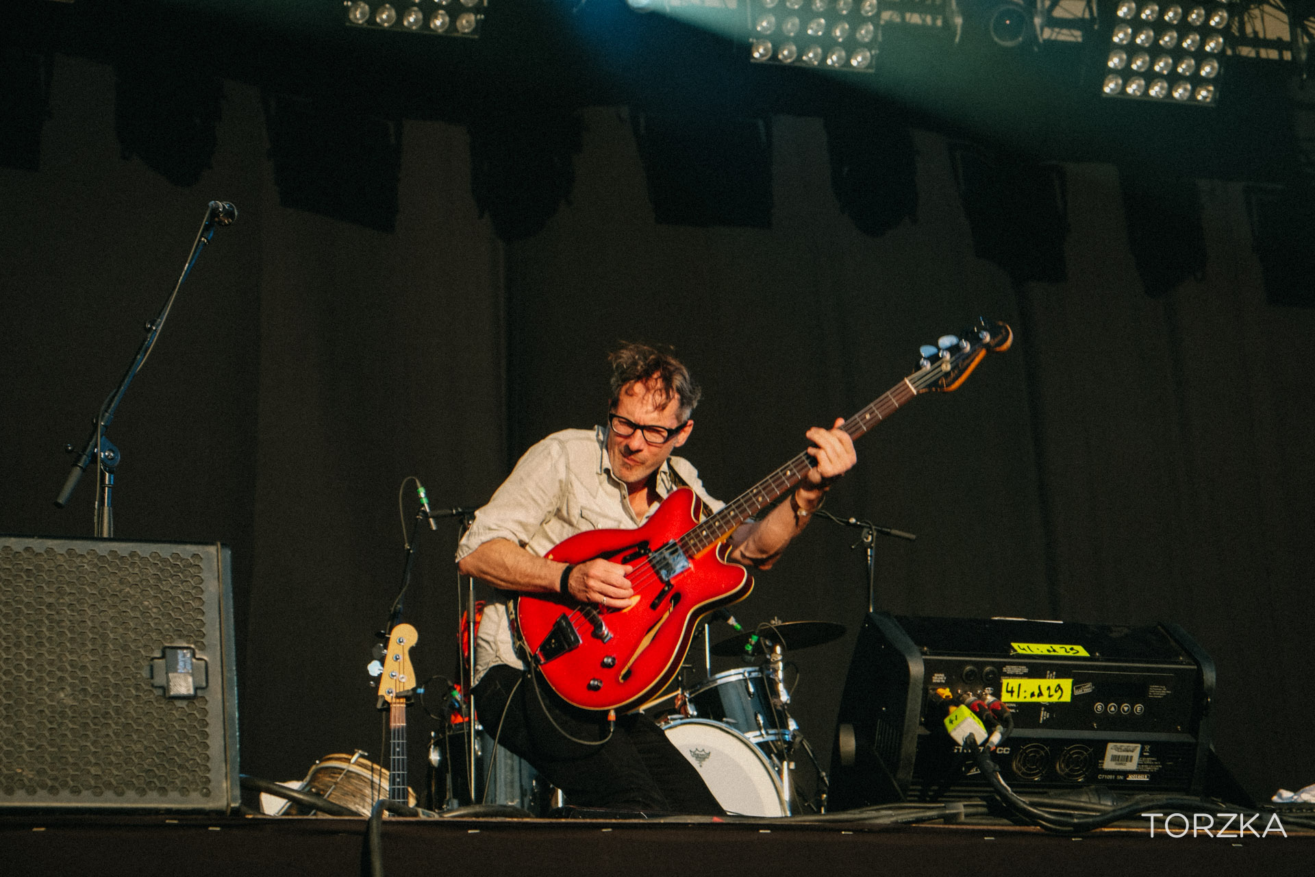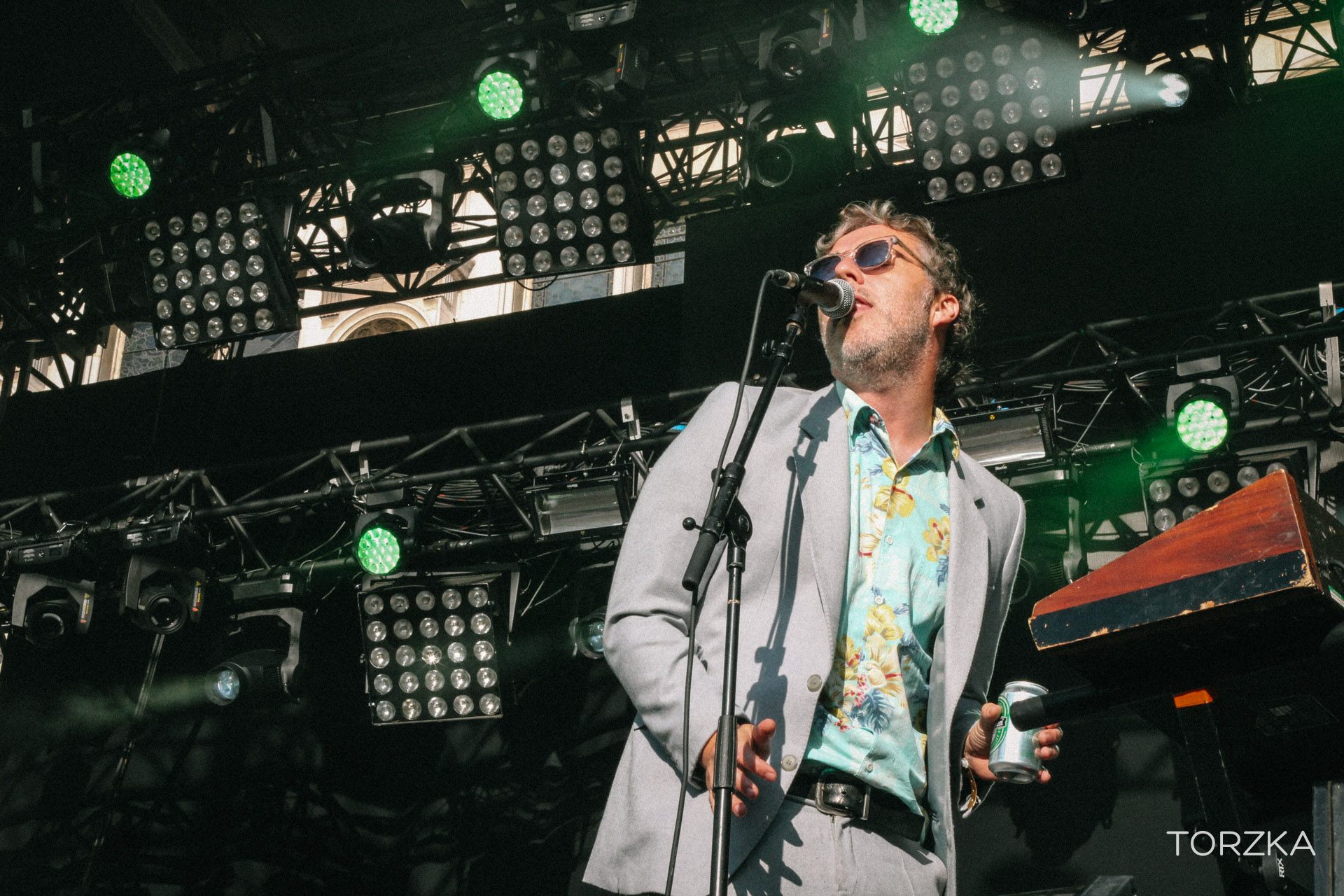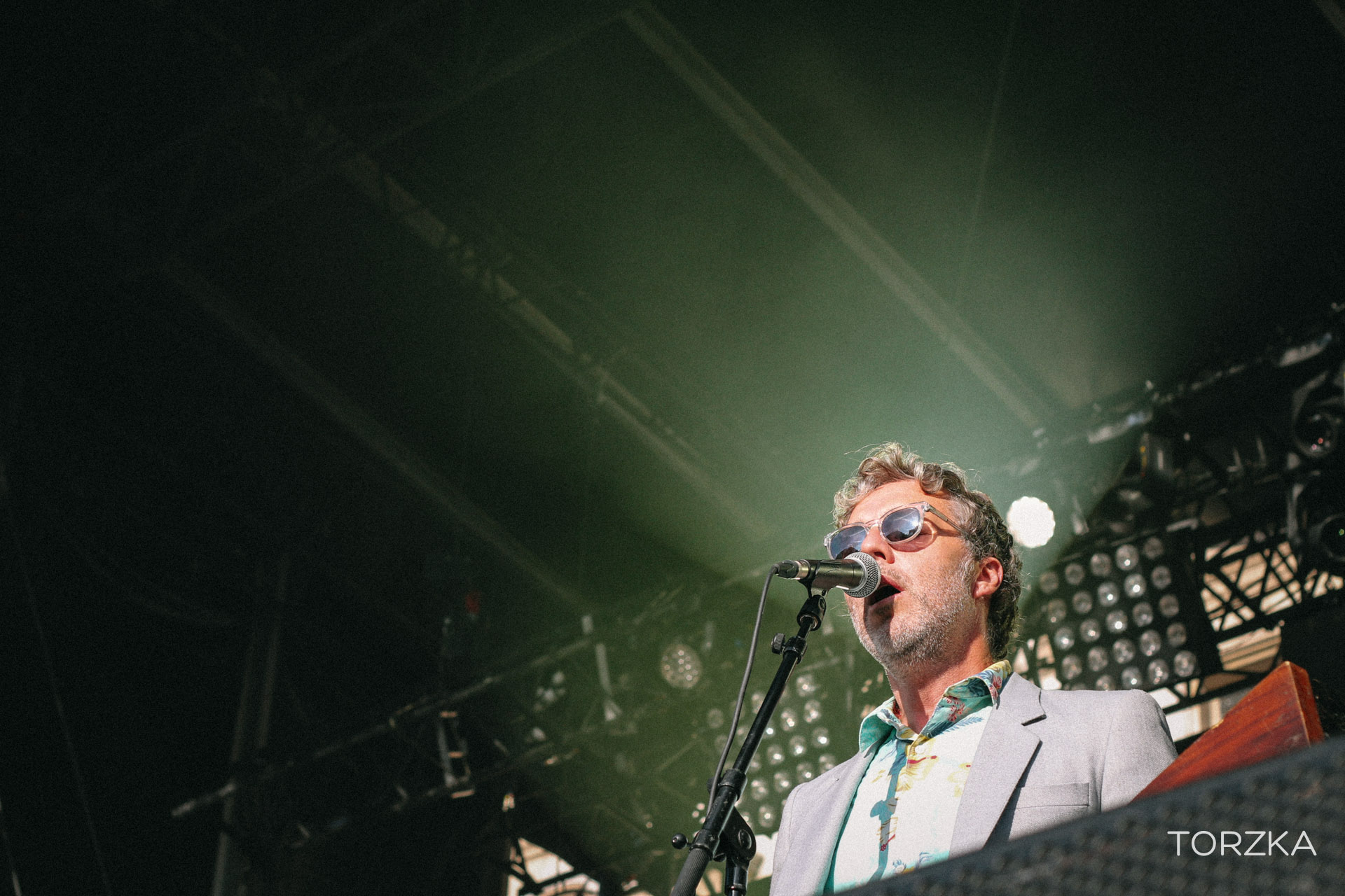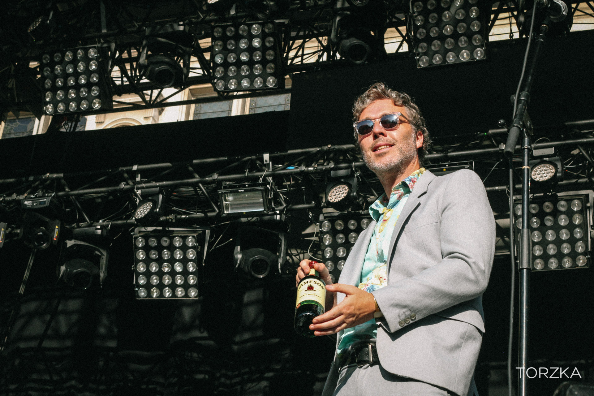Quand Baxter Dury débarque sur scène, il faut forcément s’attendre à un débarquement haut en couleur. Encore inondée de soleil, la scène de l’hôtel de ville brille de mille feux. Ce songwriter anglais qui n’a pas froid aux yeux, n’a jamais eu peur du ridicule et ce n’est pas pour déplaire au public. Deux cigognes en guise de décorum (petite pensée aux deux personnes qui ont eu le plaisir de porter ses costumes sous un soleil de plomb), l’accompagnent alors que Baxter dans un costume gris et une chemise hawaïenne, incarne la décontraction à l’état brute. Sa musique est comme lui, faussement facile, faussement cool car tout est pointu. Sa pop est léchée, entraînante et surtout séduisante. Cependant, petit bémol, je reverrai bien ce phénomène haut-en-couleur en concert mais dans une salle parisienne plus intimiste. En live, il vaut vraiment bien le détour. A suivre…
