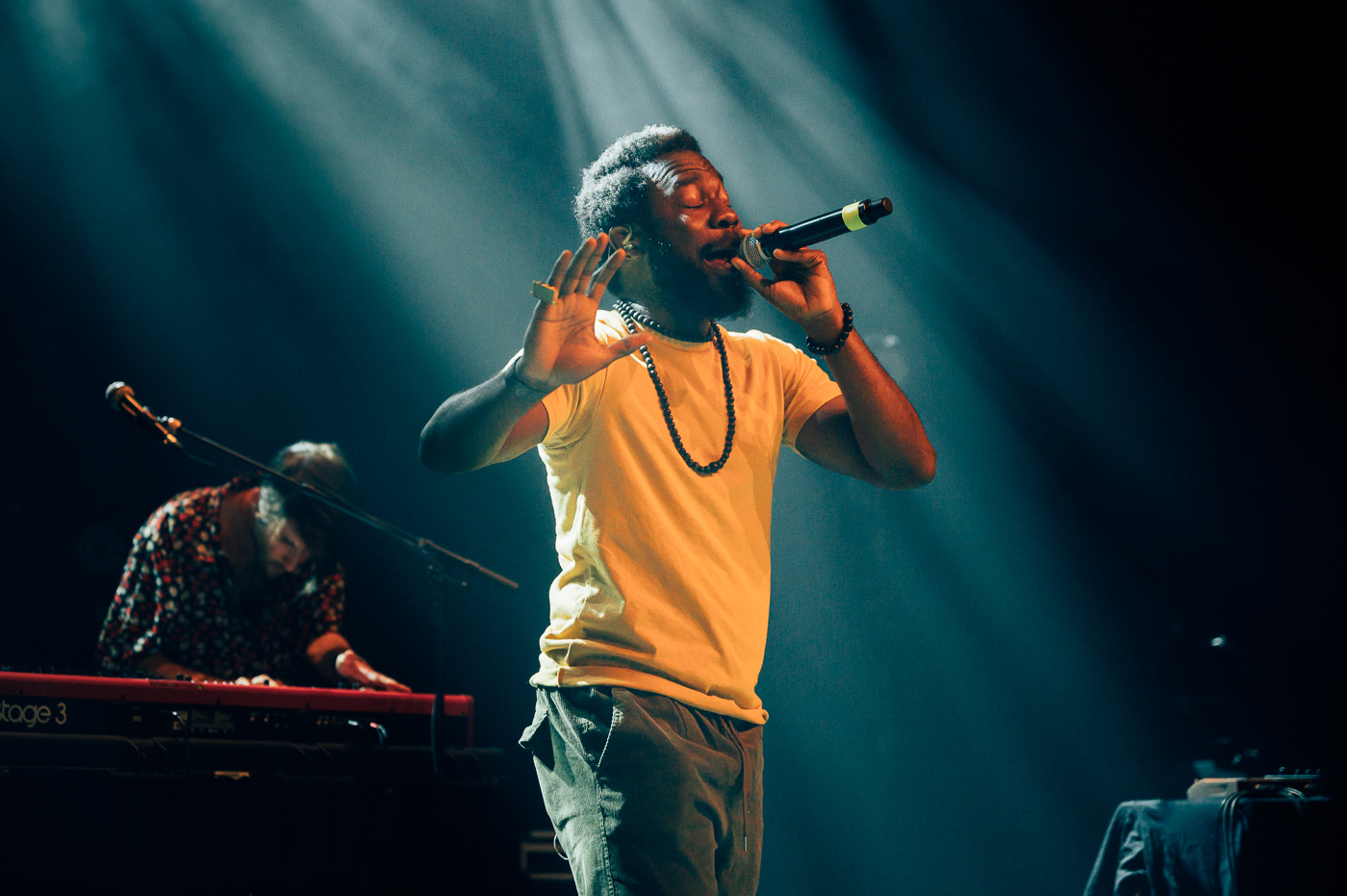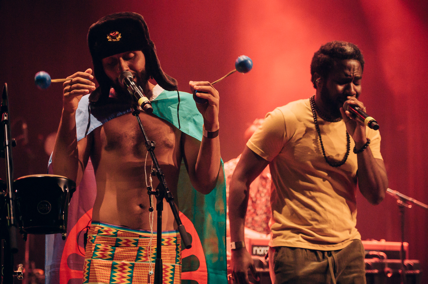 On commence avec la bromance ghanéenne de Fokn Bois. C’est accompagné d’un pianiste un peu fou que les deux compères viennent nous proposer leur rap déjanté, aux sonorités oscillant entre rap à papa et délire autotunés moderne. On a clairement affaire à un OVNI. Les musiciens s’amusent avec le public, tentent de nous parler en français avant de s’excuser tant bien que mal avant de nous lâcher un « Désolé, j’ai été colonisé par le mauvais pays » devant une audience hilare.