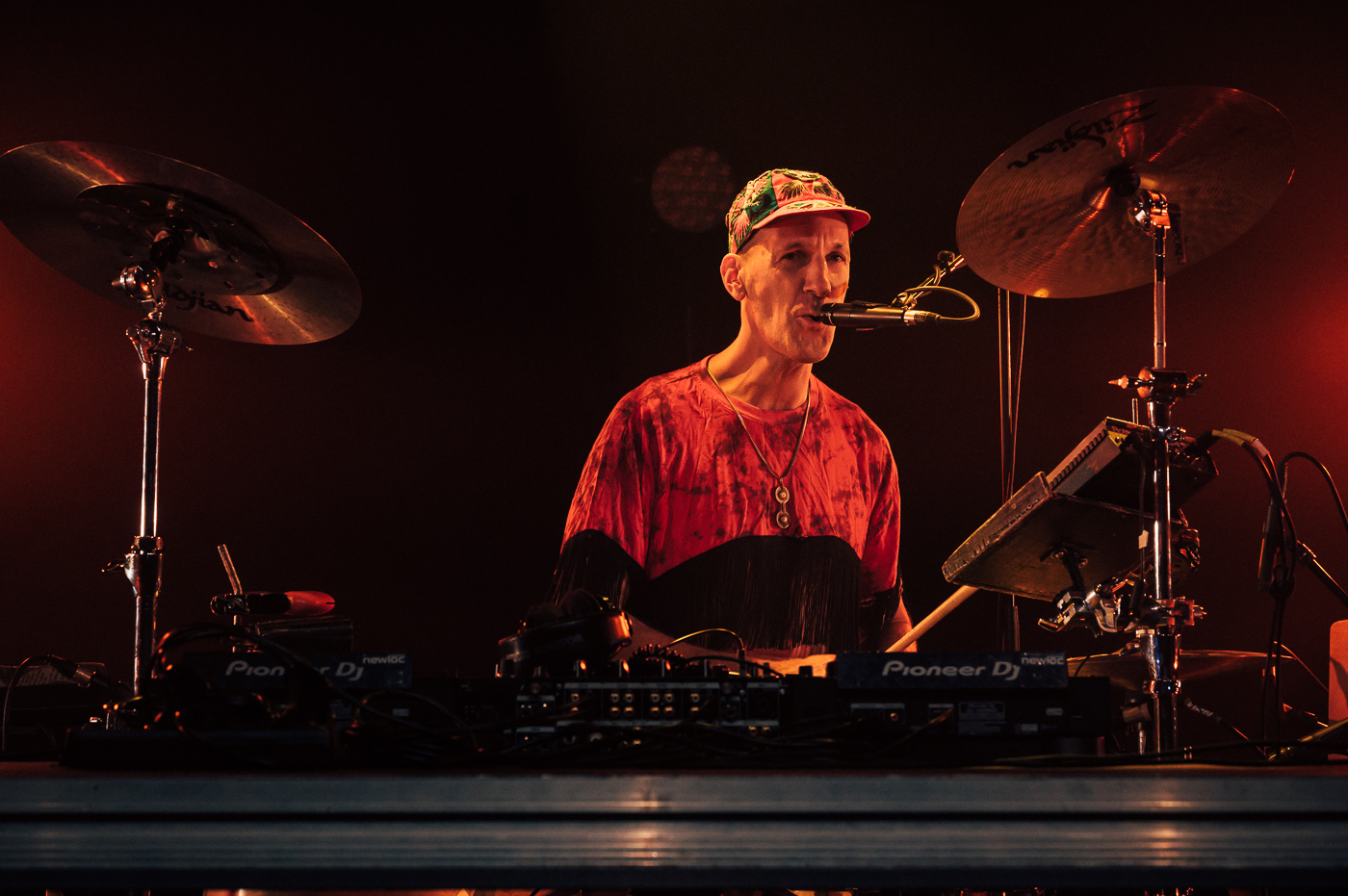 Après quelques instants, il s’installe à la batterie et se lance dans sa cérémonie. Il enchaîne une sélection de disques et de samples de sa discothèque tropicale, tout en jouant de différentes percussions et en se samplant en direct. Difficile à décrire… C’est sourire aux lèvres qu’il nous propose un concert façon dancefloor comme lui seul pouvait le faire.
