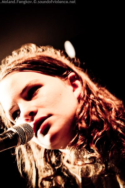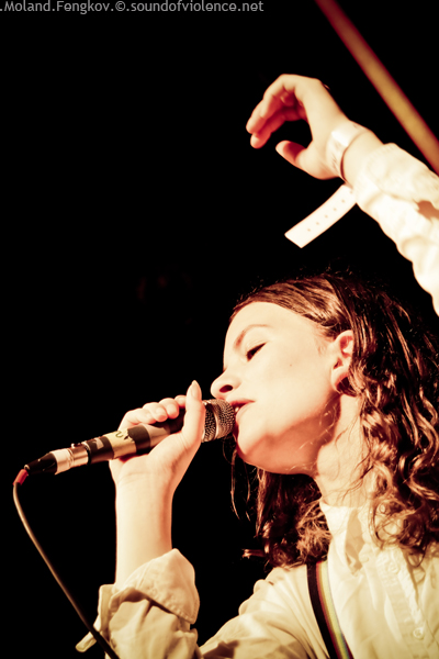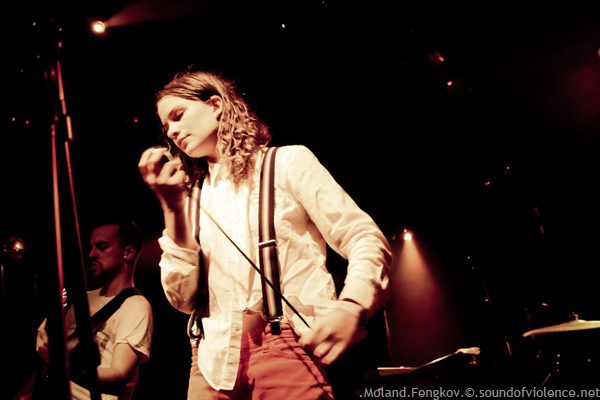 Ils débarquent, elle et ses musiciens. Elle est gracile, petit bout de jeune fille, qu’un rien pourrait faire flancher. Et pourtant… C’est une des rares jeunes artistes que j’ai pu voir sur scène immédiatement dans le concert, à fond, pas de négociation, pas de compromis, j’y suis, j’y reste. Elle est jolie, très jolie, et pourtant on sent que la féminité lui pose problème, parfois elle se replie sur elle-même, touche ses musiciens comme pour se recharger en énergie, éclate en un sourire lumineux, qu’elle reprend aussitôt, comme si on le lui avait volé, regard dur, toute en force. Elle est étrange, très étrange, et si elle n’était pas ravissante comme une fée, elle ressemblerait à un hobbit tant elle grimace et se voûte. Elle ressemble à sa génération, un peu perdue, violente et chétive, exacerbée.