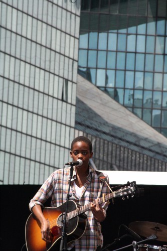 Mercredi 12h15. Un soleil éclatant inondant la scène, une jeune femme frêle s’avance seule, une guitare à la main.