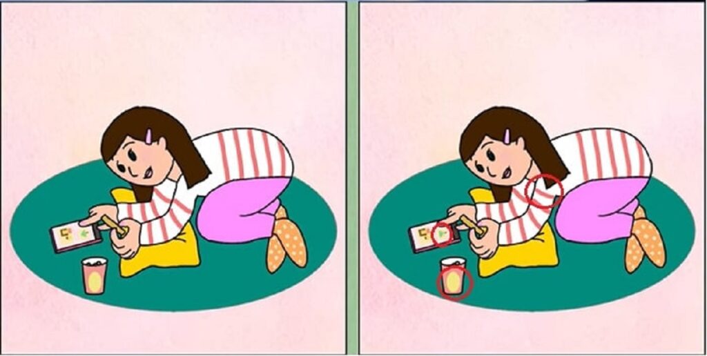 Croyez-vous pouvoir repérer les différences entre ces deux images ? C’est l’heure de tester vos talents d’observation ! Aujourd’hui, je vous propose un jeu qui met à l’épreuve votre attention aux détails et votre rapidité. Vous avez deux images d’une fille jouant sur son smartphone, et votre mission est de trouver les trois différences en moins de 40 secondes.