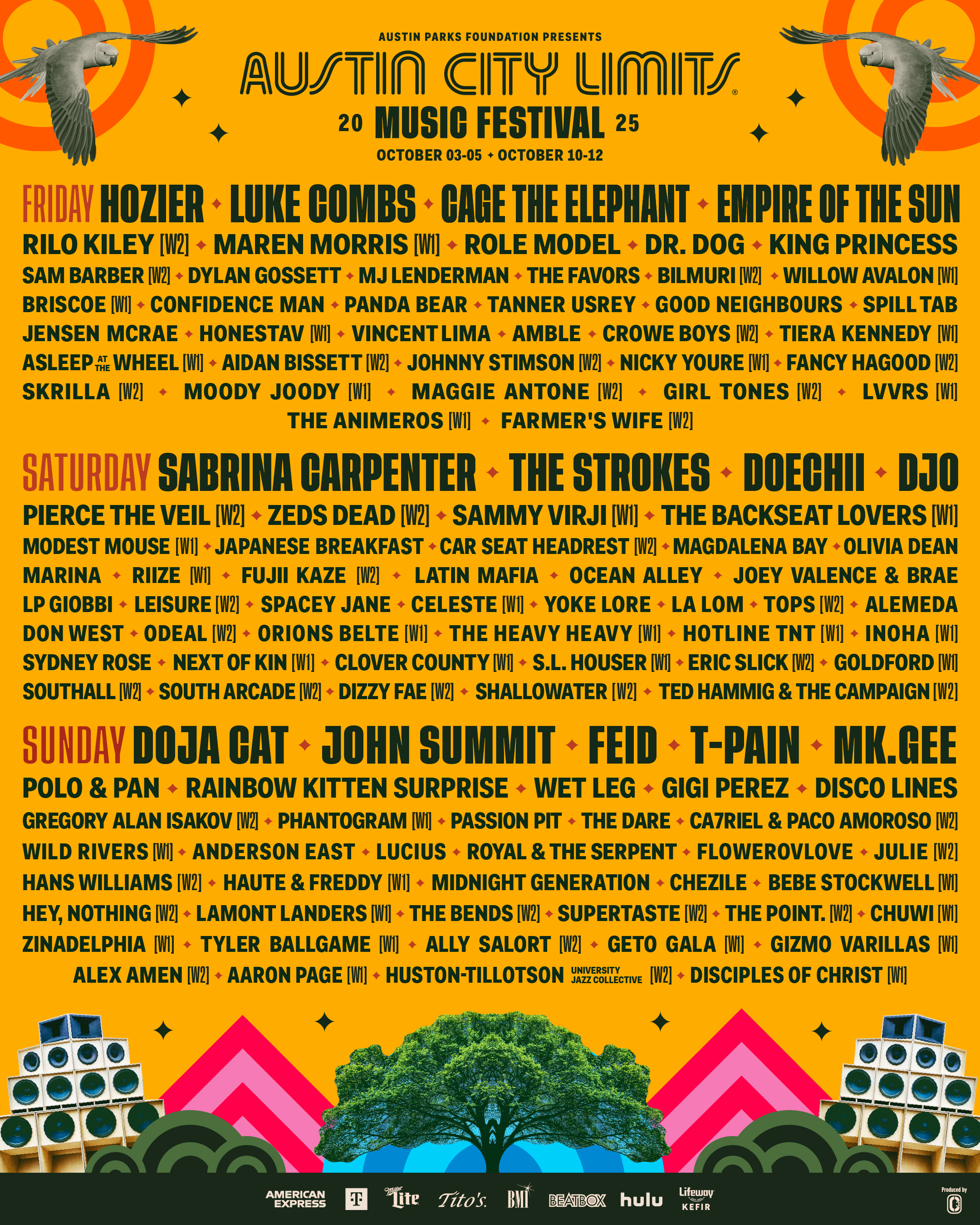 Les autres actes sur le projet de loi sur les limites des limites de la ville d'Austin incluent Doechii, Luke Combs, John Summit, Cage the Elephant, Empire of the Sun, Wet Leg, Olivia Dean, Marina, King Princess, Modest Mouse, Djo, Piscion Pit, Confidence Man et The Dare.