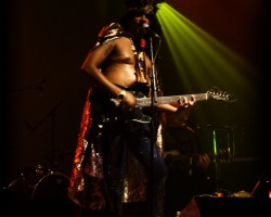 1. King Khan & BBQ. En duo minimaliste, l’Allemand King Khan (chant, costume et gratte) et le Canadien BBQ (gratte, chant et batterie  aux pieds) livrent un rock brut, criard, drôle, légèrement salace et terriblement efficace (qui pourrait rappeler à certains ce cher Bob Log III, mais sans Blues et avec une pointe de Rockabilly en plus). Le cher King envoie lourd, solote sale, gueule la corde tendue et fait preuve d’un sens de la pédagogie sans pareil lorsque d’un revers de main, il explique gentiment à l’agent de sécurité de simplement dégager de la fosse et de laisser les gens danser tranquille… Bref, tout ça est très bon enfant et on se marre franchement en secouant copieusement la tête. Parfaite mise en bouche avant de pénétrer plus en avant dans la soirée.