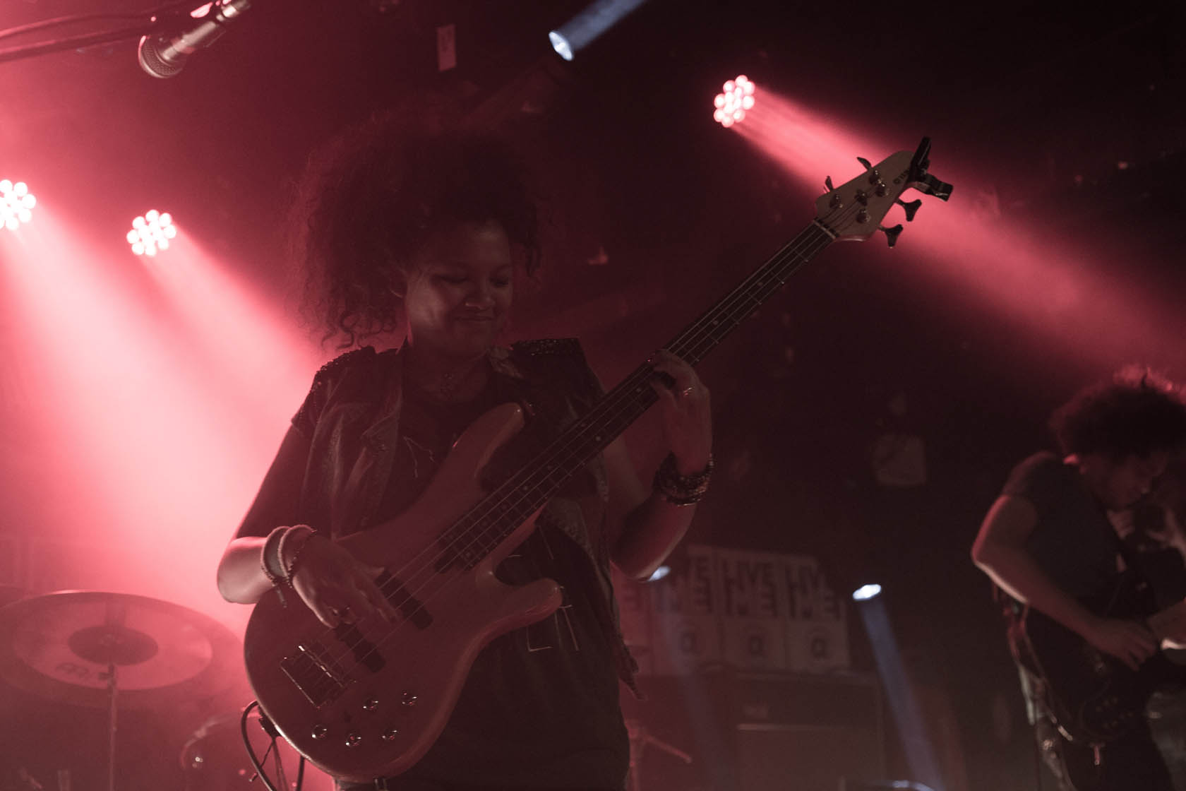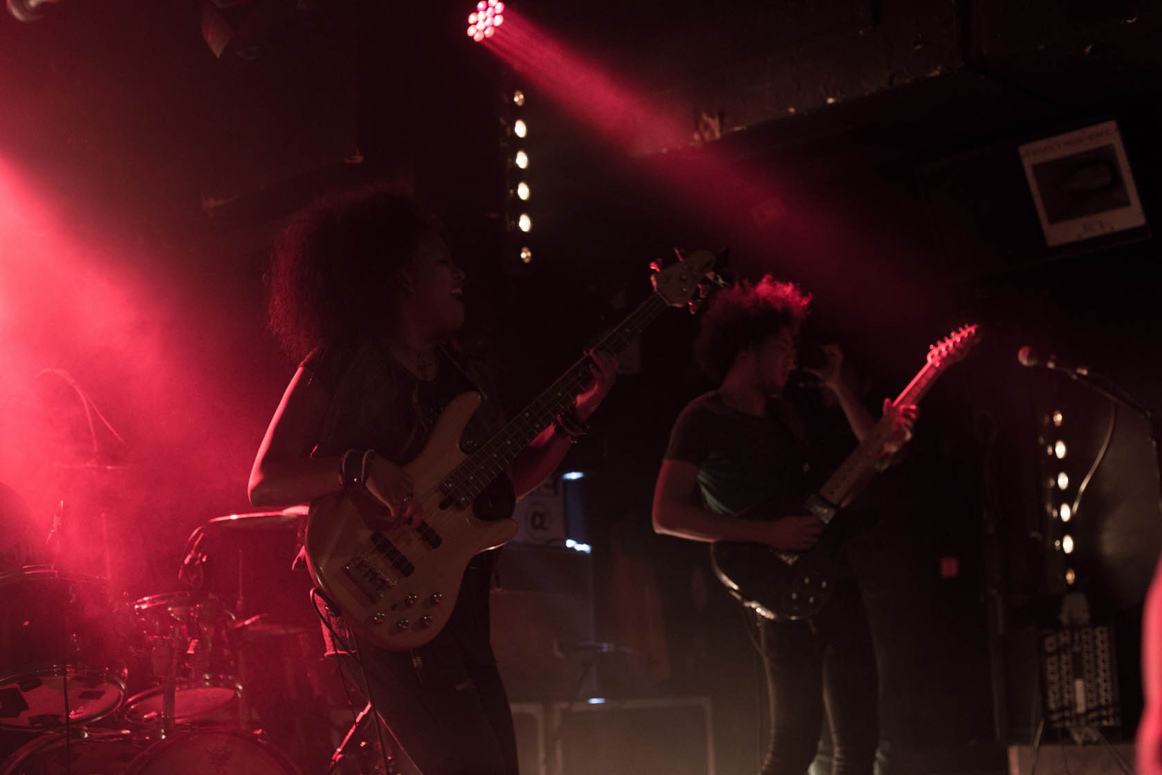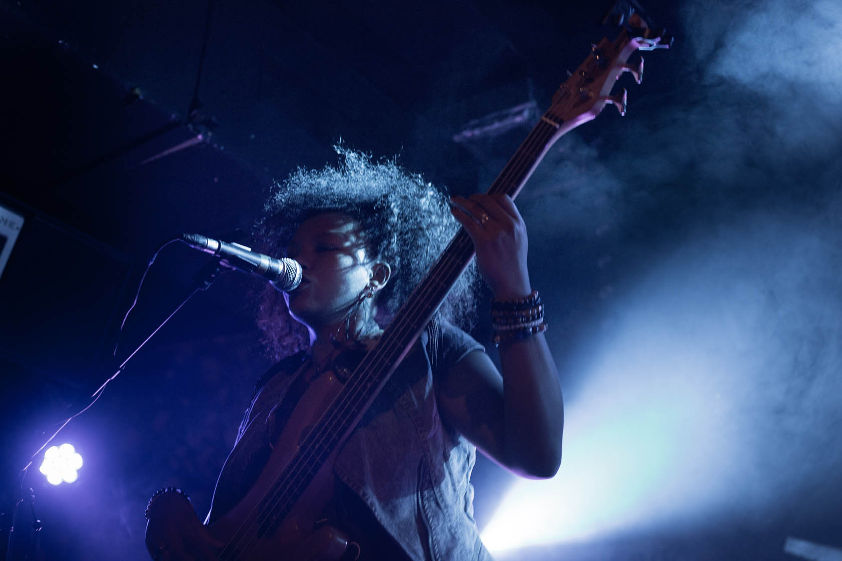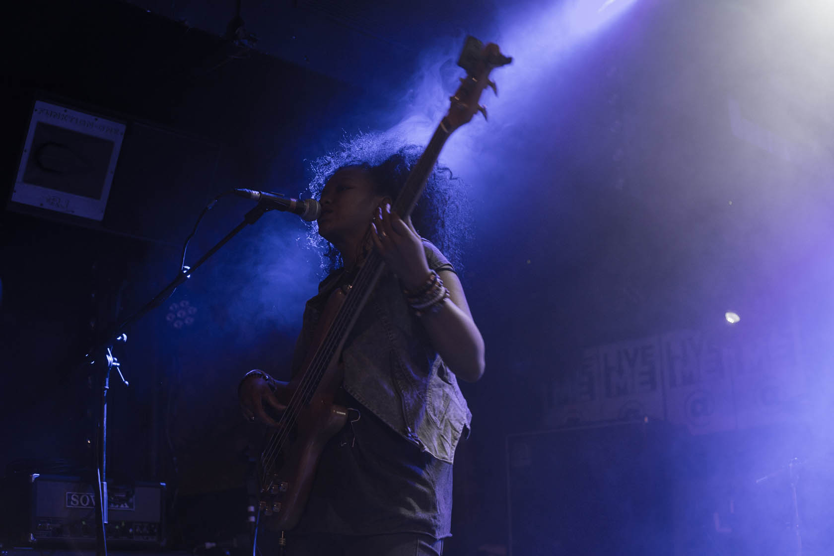 J’arrive pile pour le début du concert, la salle est remplie, beaucoup sont venus pour voir le trio. La chanteuse et bassiste, Christelle Ratri, s’annonce fièrement “Kristel, Madagascar”. Elle enchaîne immédiatement les chansons avec un dynamisme assez étonnant. Je sens bien qu’elle en veut et qu’elle est là pour s’imposer, elle lance des regards presque de défi à la foule. Le guitariste, Ben Kheli, l’accompagne pour des coeurs, ils font ensemble des solos très sympa. On sent la complicité entre eux.