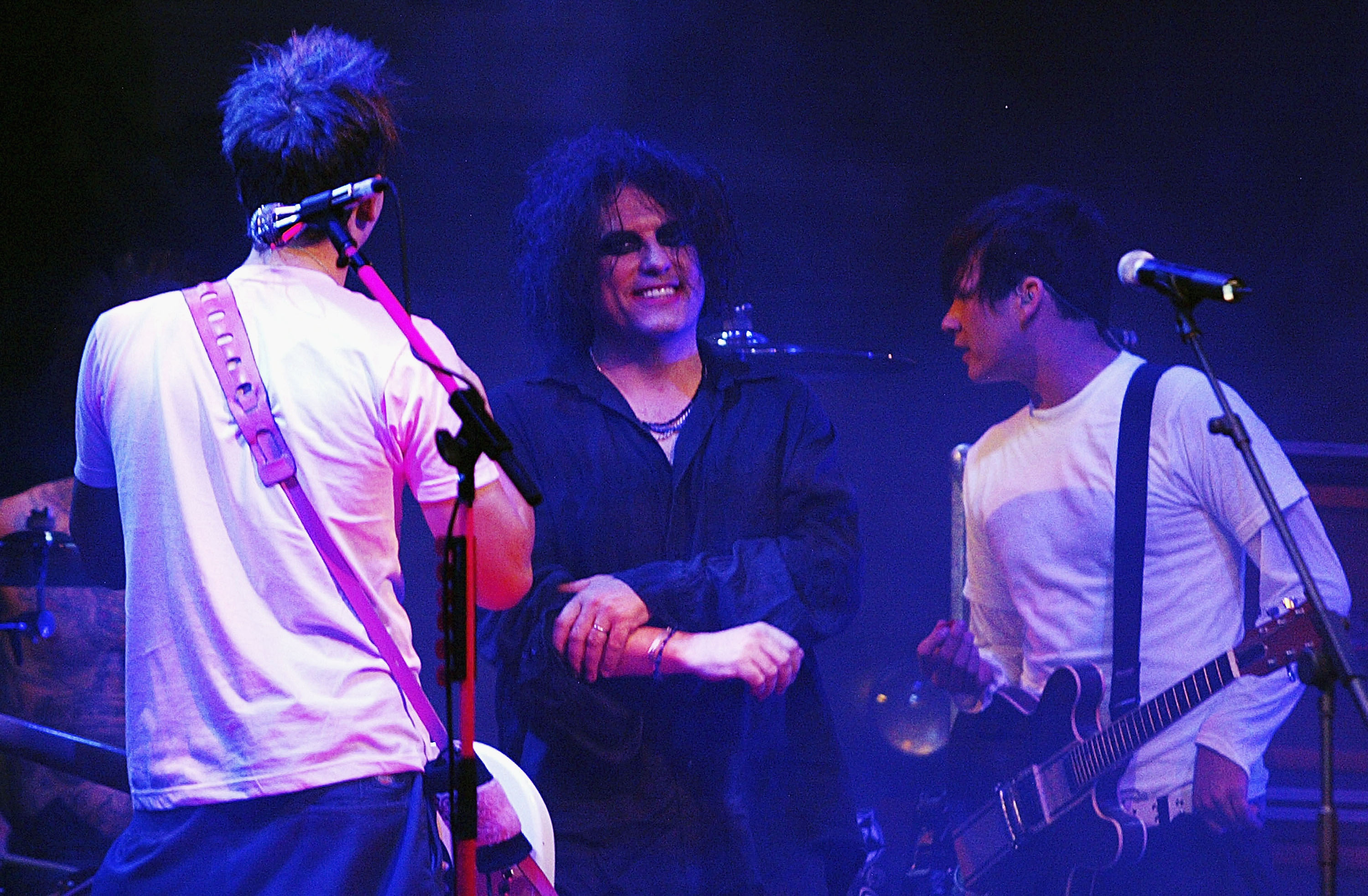 Robert Smith jouant avec Blink 182 à Londres à Old Billingsgate Market le 17 septembre 2004. Crédit: Jo Hale / Getty Images pour MTV