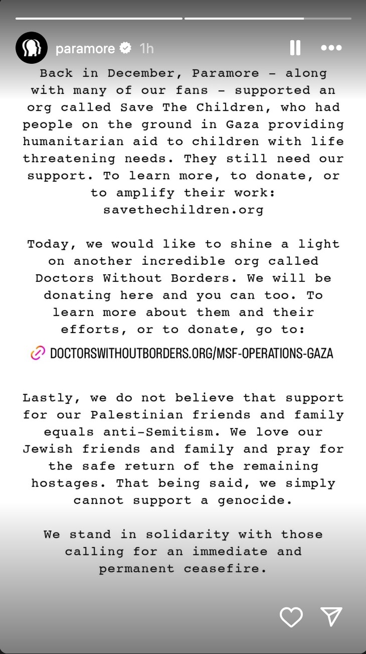 Sur Instagram Stories, ils ont écrit : « En décembre, Paramore – avec beaucoup de nos fans – a soutenu une (organisation) appelée Save The Children, qui avait des personnes sur le terrain à Gaza pour fournir une aide humanitaire aux enfants dont la vie était en danger. Ils ont encore besoin de notre soutien.