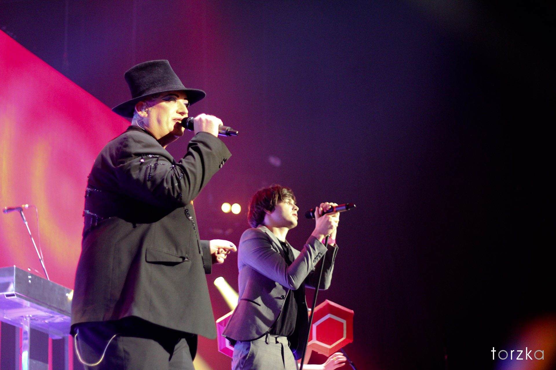 Artiste suivant : Mark Ronson accompagné de son Business Intl. Chevelure couleur platine, costume élégant et Repetto blanches aux pieds, Mark Ronson fait défiler les tubes aux côtés de son live band avec un invité de marque sur la chanson « Somebody to love me » puisque Boy George fera son apparition avec Andrew Wyatt ! Ca sera la première surprise pour le Zenith mais il y en aura d’autres ! Mark rappellera un moment au public qu’il a également été DJ en balançant son désormais classique « Ooh wee » avec Spank Rock dans le rôle du Emcee. Le set se terminera sur la chanson « Valerie » sans Amy mais un très bon Kyle Falconer et un Mark Ronson qui quittera un moment ses machines pour se rapprocher du public.