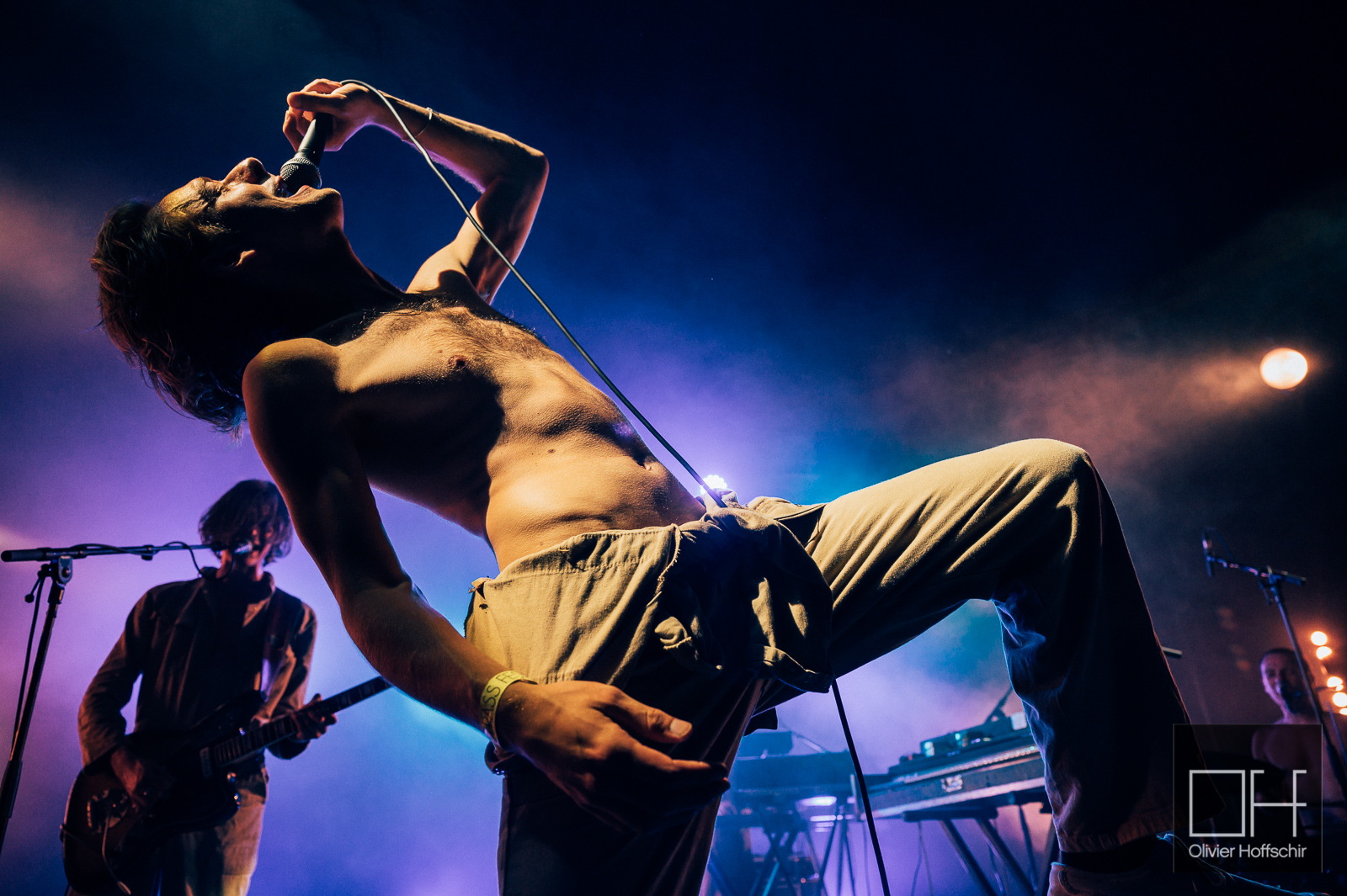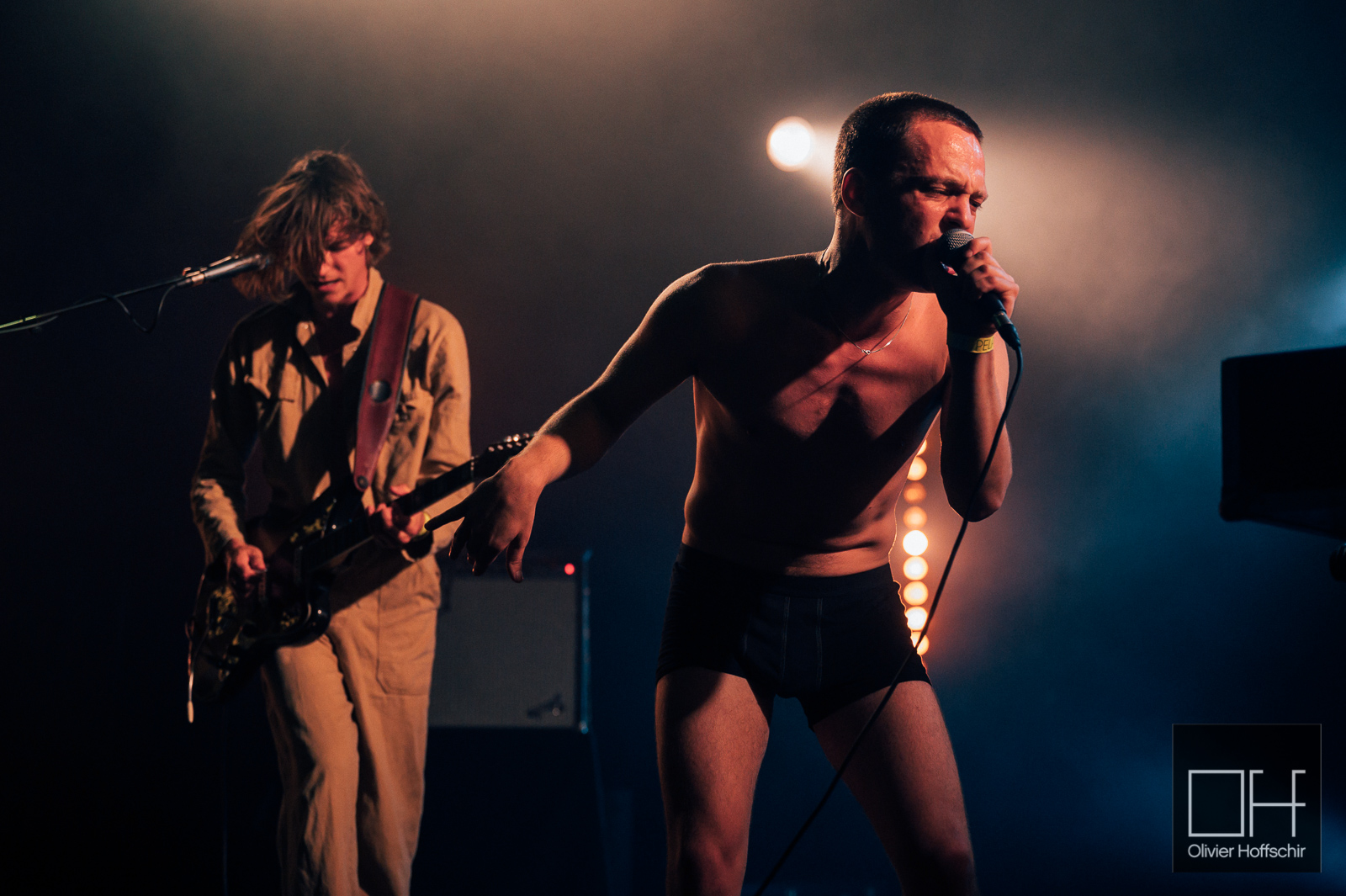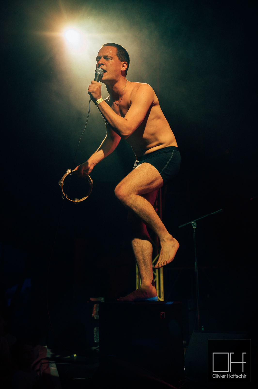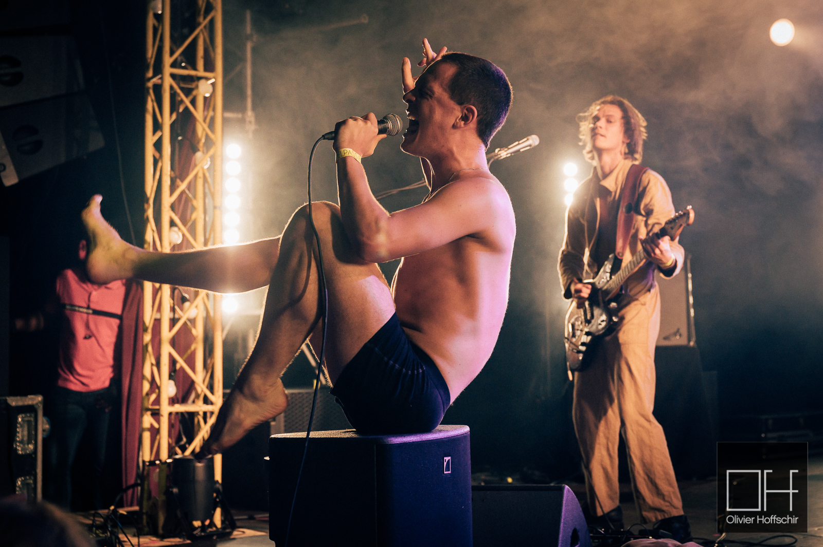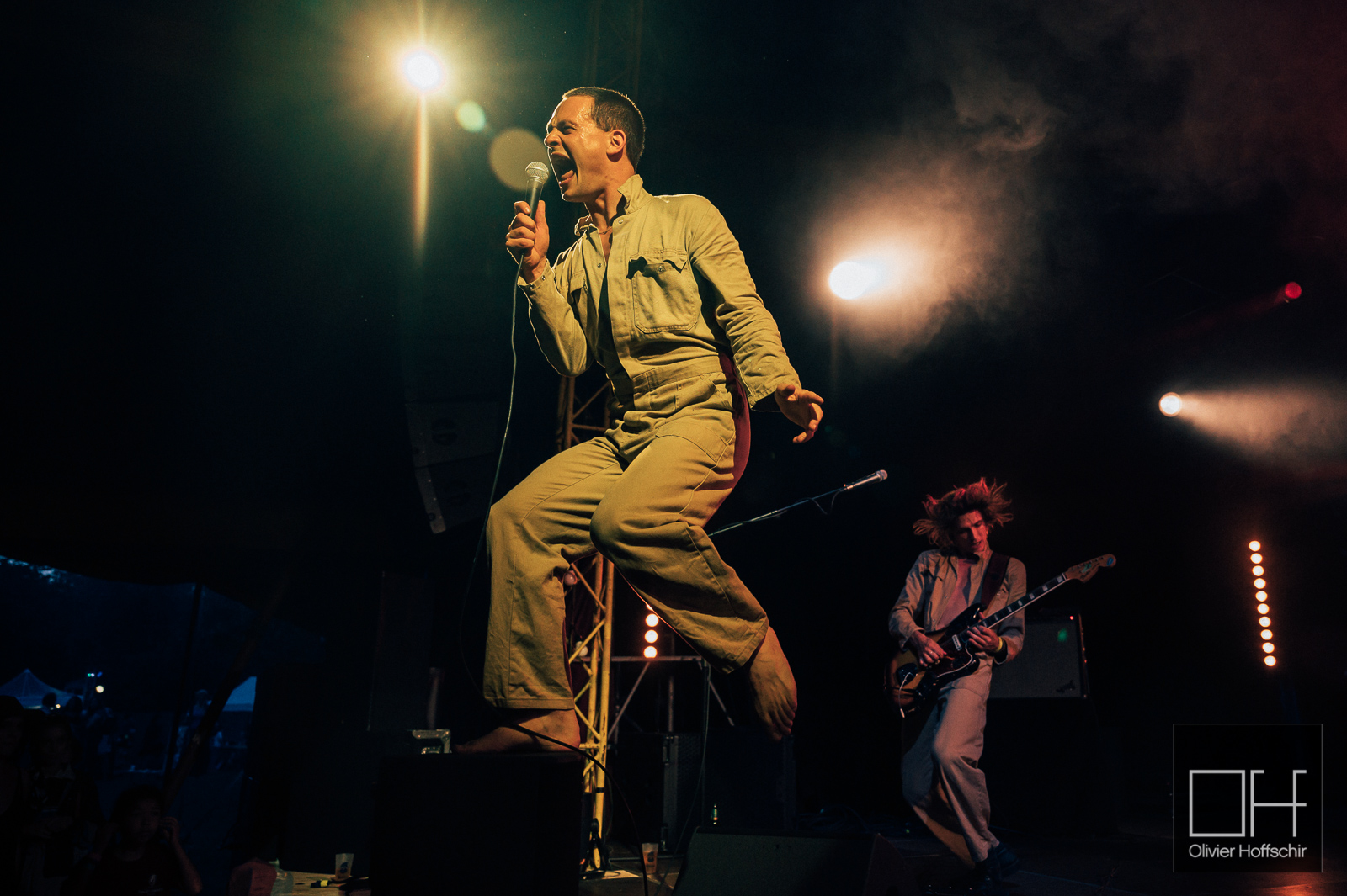 Je commence ma journée avec l’ovni SHHT (tient encore des Belges, décidément). Défini comme du « Rock spatial pour la génération actuelle » dans leur bio. Bon, honnêtement, je ne sais pas trop définir la chose musicalement, mais l’énergie est plutôt punk. Le groupe est définitivement venu assurer le show. Le chanteur enchaîne les cascades sur une scène qui sera très rapidement maculée de bière. L’équipe technique du festival de son côté essaie tant bien que mal de garder les retours son, câbles de micro et autres instruments en place pendant que le chanteur se promène dans le public ou en haut du chapiteau, le tout de préférence en slip.