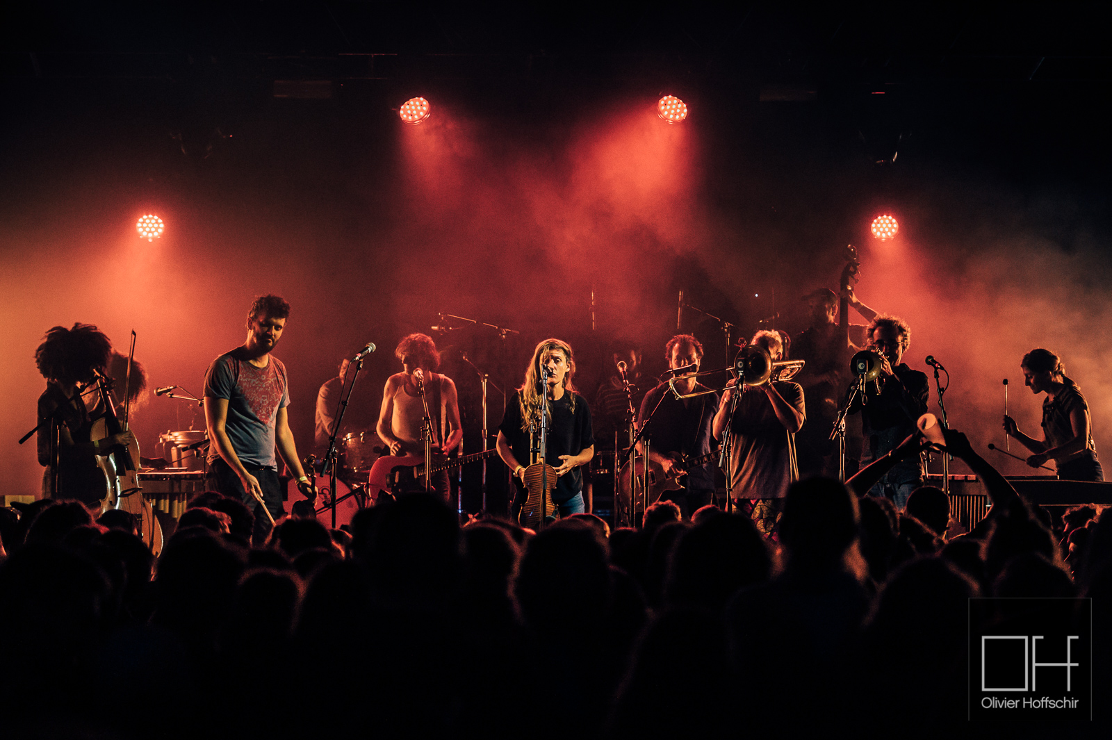Je finis ma soirée et mon festival sur le fameux Orchestre Tout Puissant Marcel Duchamp qui n’a pas volé son nom d’orchestre. C’est 13 musiciens qui seront sur scène, avec violon, alto, violoncelle, trombone, trompette, deux guitares, deux marimbas, contrebasse et deux percussionnistes. Leur son fait danser, il surprend parfois, fait réfléchir et au final apporte la bonne humeur qu’il nous fallait pour finir la soirée.