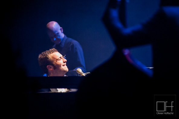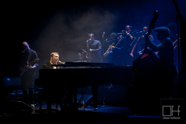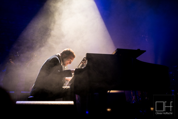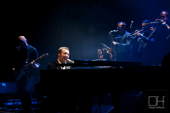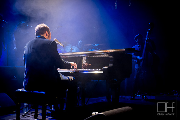 La salle est déjà pleine quand Raphaël Gualazzi se présente sur scène avec ses musiciens et s’installe derrière son piano à queue. Le grand gaillard, d’apparence très sage, a l’air intimidé d’être là. Cette impression est vite balayée dès que la musique démarre et que le pianiste pose ses mains sur le clavier. Ca envoie du lourd comme on dit !