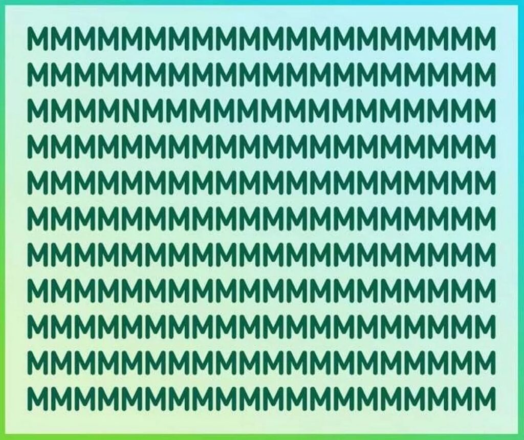 Dans ce casse-tête visuel, vous verrez 11 rangées de la lettre « M », mais parmi elles se cache une lettre « N ». Votre mission est de repérer cette lettre impaire, mais attention, cela s’avère plus difficile qu’il n’y paraît. Notre cerveau, parfois, nous joue des tours lorsque nous tentons de distinguer des motifs répétitifs.