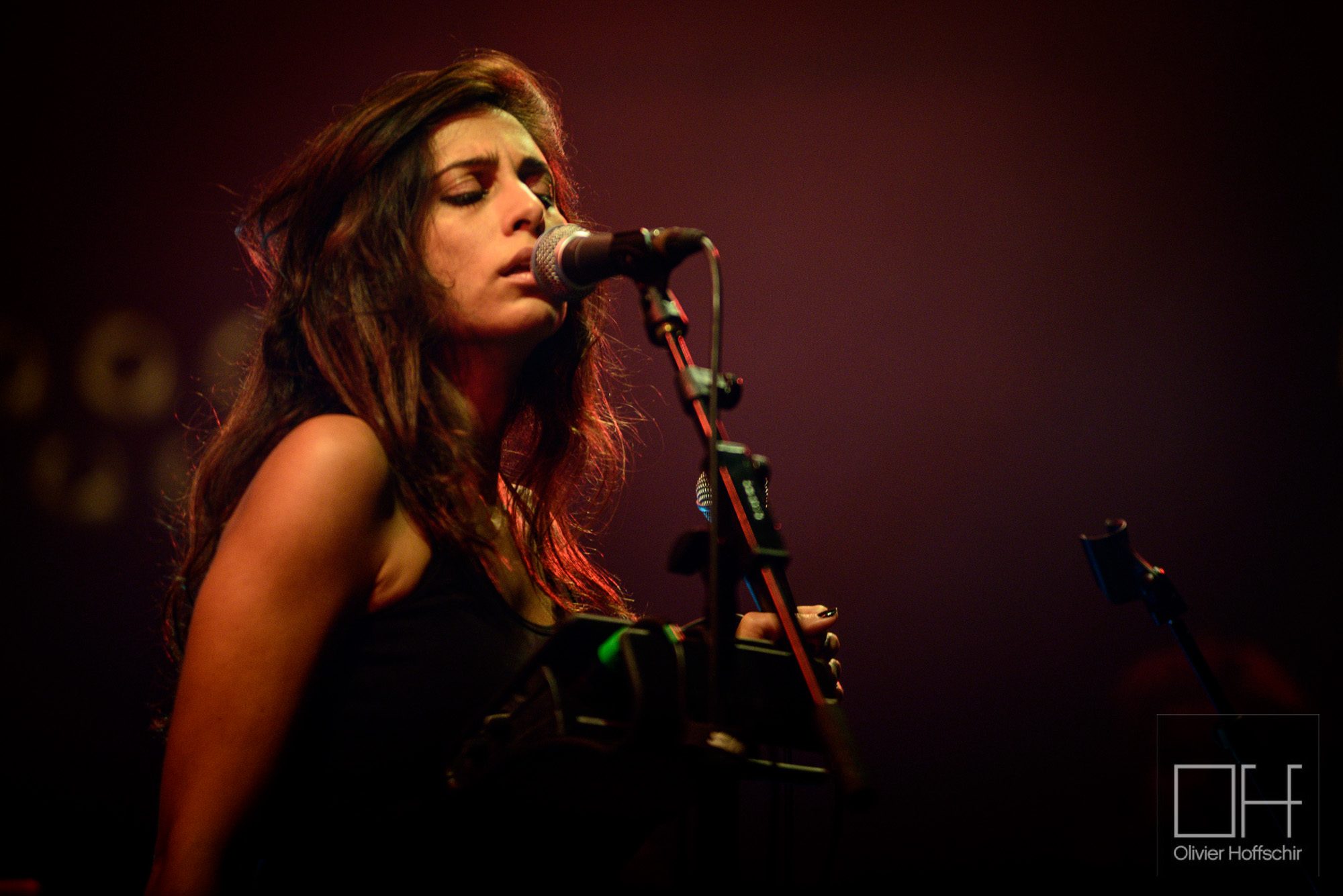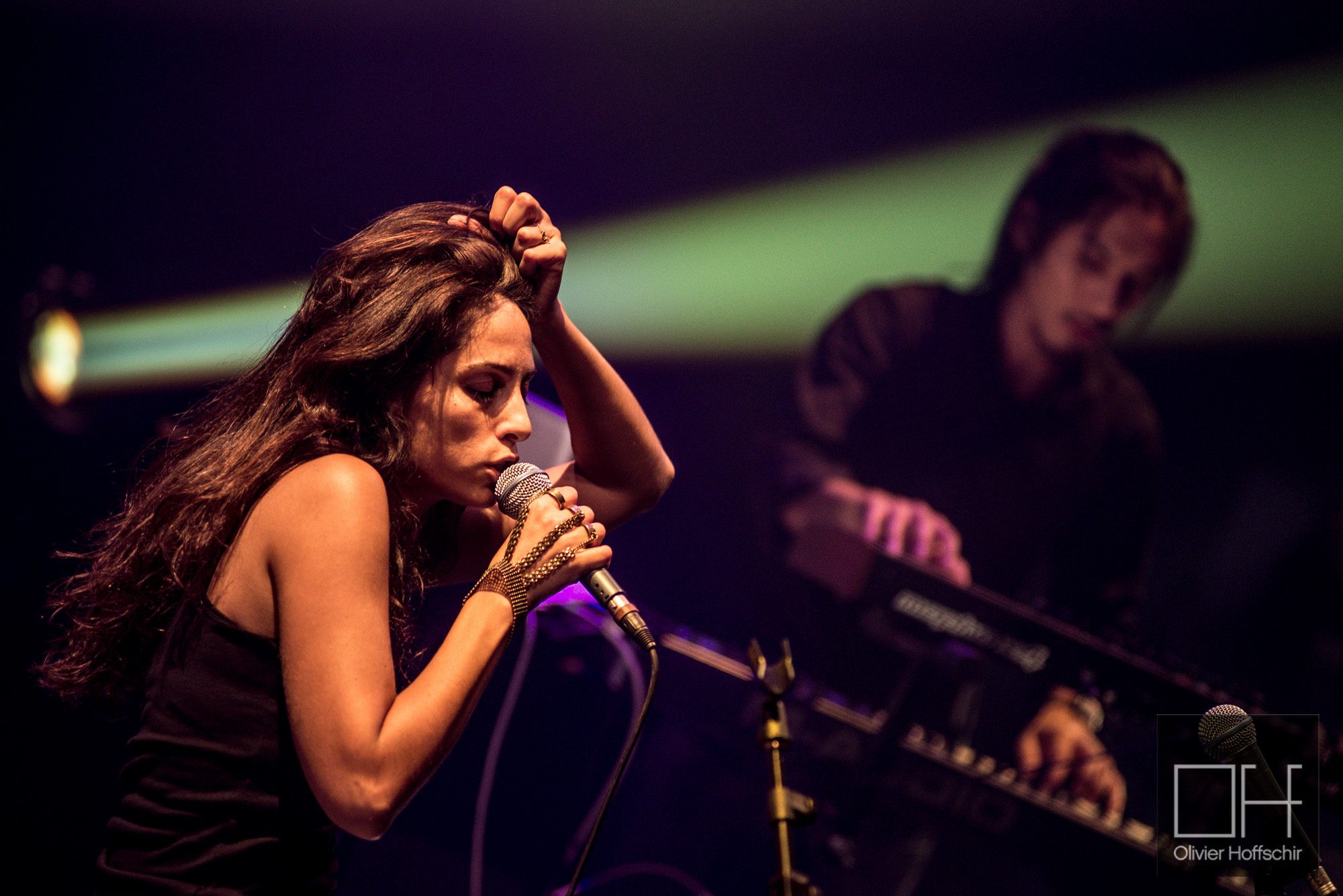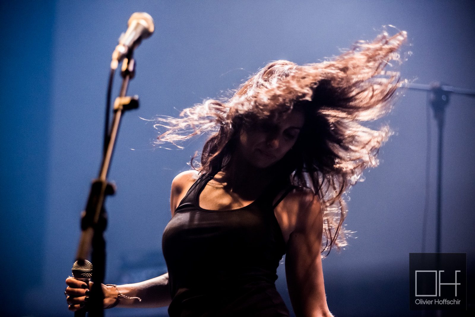 Il est souvent question des femmes, de leurs combats à l’instar du morceau Aziza. La chanson raconte l’histoire d’une femme qui a pour habitude de se faire avoir par les hommes et qui à la fin, renverse la situation. Yasmine esquisse d’ailleurs un léger sourire en narrant l’histoire. Elle adore communiquer avec le public. Tout au long de ce morceau, la batterie claque et se fait tempêtueuse sur des rythmes rock n’roll effrénés. Elle module sa voix et elle chante même avec deux micros à la fois. Le public semble entièrement captivé. On ne sait qui de sa musique ou de ses mouvements ondulatoires est le plus hypnotique. Sur le titre Khalas (seul mot que je connais qui signifie « assez »), je me laisse charmer et envahir par l’émotion. Une grande complicité émane entre elle et ses musiciens, d’ailleurs le batteur s’avère être un compagnon de longue de date. Sur Beirut, la mélodie se fait plus douce. Yasmine nous apprend alors qu’elle tire cette chanson d’un poème libanais d’Omar El Zenni écrit dans les années 40. Sur Deny, il est moins question d’artifices sonores, l’orientalisme de ses compositions s’associe cette fois à la folk. Avec Yasmine Hamdan, vous vous risquez à une belle claque scénique. Elle fait partie de ses artistes que vous ne pouvez ne pas voir en live tant elle est charismatique. Je ne saurai trop vous recommander l’écoute de son album « Ya Nass » qui révèle de vrai petits trésors mélodiques.