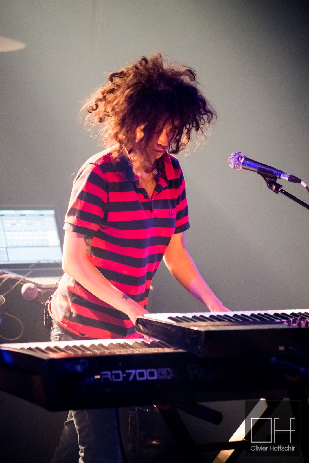 Sur la scène de la Gaîté Lyrique, la jeune femme multi-instrumentaliste, passe du clavier qu’elle caresse en toute délicatesse à la batterie qu’elle percute avec force et dextérité. Rien de surprenant car Léonie, est diplômée du Conservatoire en percussions classiques. Cependant malgré un parcours académique, elle croise le chemin de l’électro via Yuksek ou encore Scratch Massive qu’elle accompagne aux percussions en 2013 lors de leurs concerts.