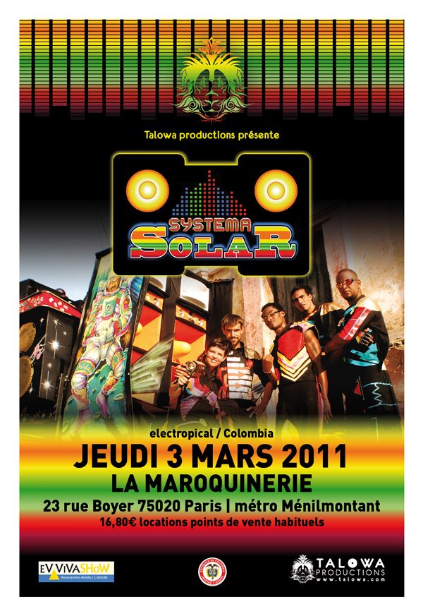 Mais Systema Solar prolonge le spectacle au-delà de la musique. Le groupe est issu de la culture « Picos », ces sound system pickup qui traverse les quartiers avec un seul but, se faire remarquer pour faire danser un maximum de gens. Sur scène on aura donc droit à un VJ des plus bling pour habiller la prestation musicale. Bref, tous les moyens sont bons pour nous faire bouger.