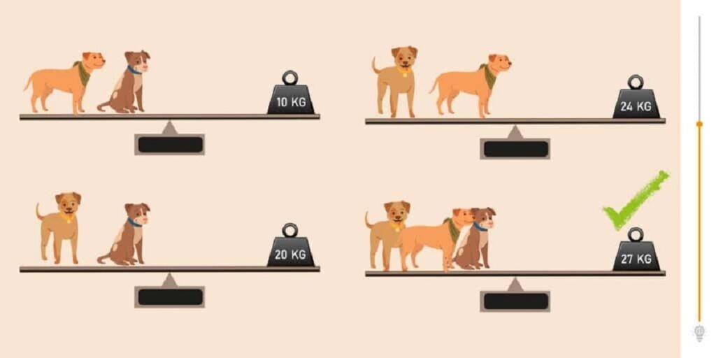 Le défi est simple en apparence : vous devez déterminer le poids total de trois chiens. Pour ce faire, vous disposez de trois indices, chacun indiquant le poids de deux chiens ensemble (par exemple, chien A + chien B, chien B + chien C, et chien A + chien C). Ces indices sont en réalité des équations avec plusieurs inconnues, et c’est à vous d’utiliser vos compétences en mathématiques pour les résoudre.