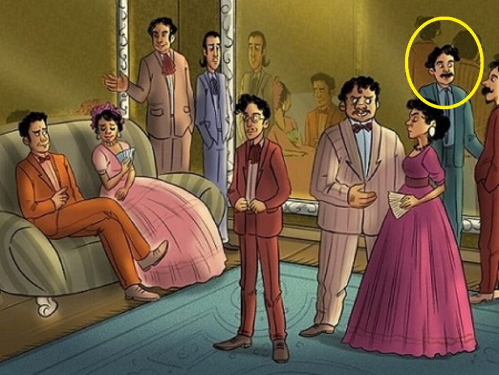 Si vous avez regardé l’image attentivement, vous aurez peut-être repéré un indice clé : l’absence de reflet. En effet, le vampire dans cette pièce est l’homme situé dans le coin à droite de l’image. Ce personnage n’a pas de reflet dans le miroir et, si vous observez bien, il a aussi des crocs ! Une fois que l’on a ces éléments en tête, la solution paraît évidente, mais il fallait y penser rapidement.