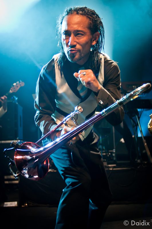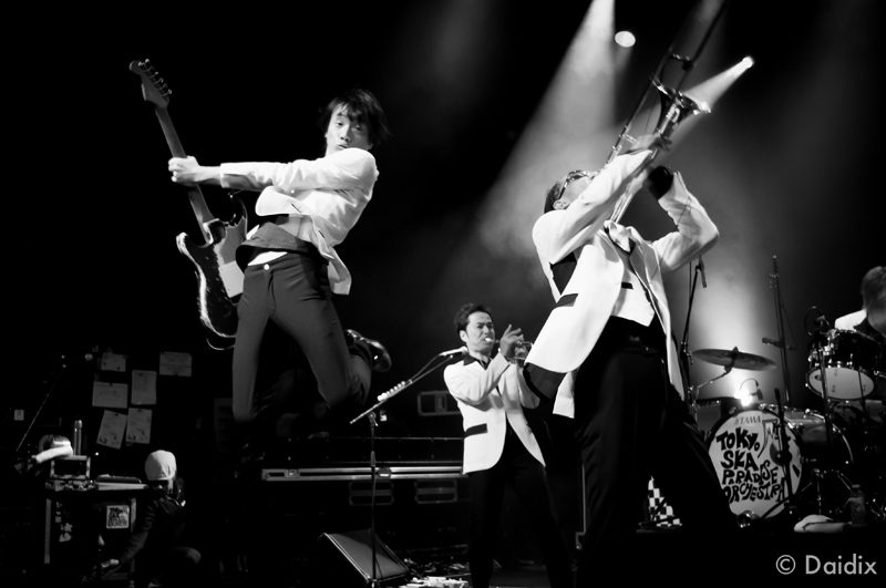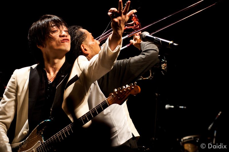 Mais ce que je retiendrai surtout c’est cet improbable mélange de Ska, de Jazz et de culture japonaise. Musicalement, on frôle la perfection. On sent que les gars sont des virtuoses, des vrais musiciens qui maitrisent parfaitement leur instrument, avec toute la rigueur japonaise que l’on peu imaginer. On mélange ça avec l’esprit festif du Ska, et on met une très très grosse dose de show à la japonaise. Oui, je sais ça fait plein de clichés sur les japonais. Mais force est de constater qu’ils maitrisent parfaitement leur scénographie. Chaque morceau a sa chorégraphie, chaque musicien a son rôle sur scène et le tout est fait avec naturel, sans nuire un instant à la qualité de la musique. Je vous invite à jeter un coup d’œil aux photos pour vous faire une idée.