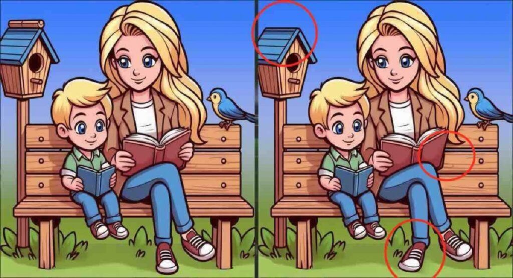 L’image montre une femme et son fils assis sur un banc, tous deux plongés dans leurs lectures. Pourtant, si vous regardez attentivement, trois différences se sont glissées entre les deux images. Votre mission ? Les retrouver avant que le chronomètre n’atteigne 13 secondes !